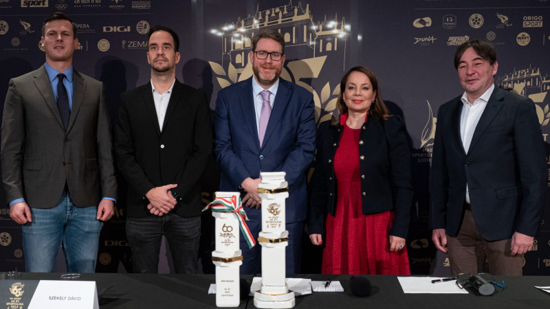 A világbajnoki bronzérmes és Európa-bajnoki ezüstérmes gátfutó, Székely Dávid, az M4 Sport csatornaigazgatója, Szöllősi György, az MSÚSZ elnöke, Csisztu Zsuzsa, a magyar, valamint a Nemzetközi Sportújságíró Szövetség (AIPS) alelnöke és Szabó László, a Magyar Paralimpiai Bizottság elnöke (b-j). MTI/Szigetváry Zsolt