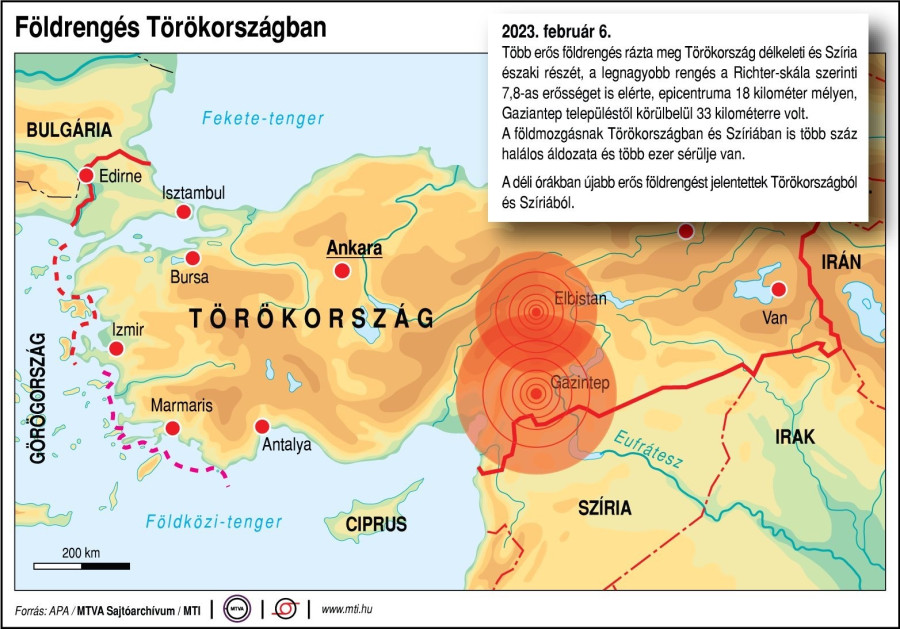 A török katasztrófavédelem adatai szerint helyi idő szerint 4 óra 17 perckor a dél-törökországi Kahramanmaras tartomány Pazarcik körzetében 7,4-es erősségű földrengés következett be, amelyet 4 óra 26 perckor a délkelet-törökországi Gaziantep tartomány Nurdagi körzetében egy 6,4-es erősségű, majd 4 óra 36 perckor Gaziantep Islahiye körzetében egy 6,5-ös erősségű rengés követett.