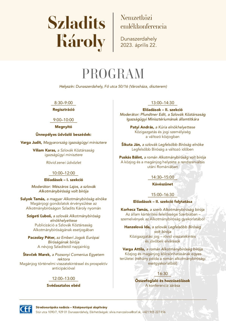 A Közép-európai alapítvány (CEF) egyik fontos célja, hogy megteremtse a közös gondolkodás nyílt fórumait, ezért megtiszteltetésnek érezte, hogy főszervezője lehetett ennek a magas szakmai értékű rendezvénynek és ezzel tiszteleghetett a magyar jogtudomány, illetve a 20. századi modern magyar magánjog iskolateremtő egyéniségének, Szladits Károlynak.