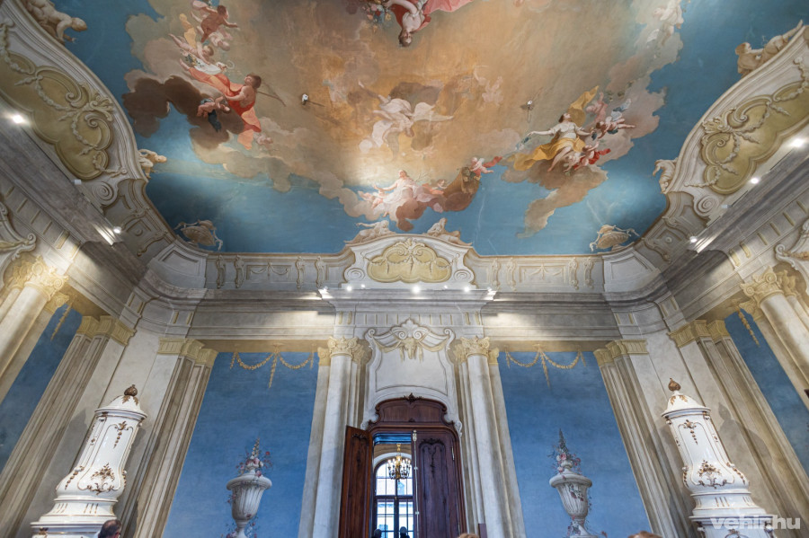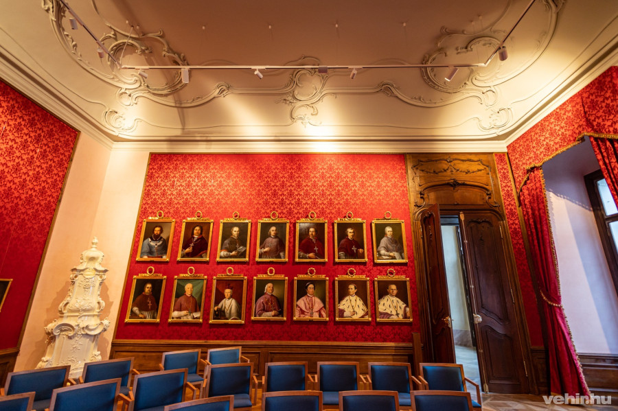 De ugyanígy a veszprémi püspökökről is megannyi történetet tudott elmesélni, viszont ezt már az Érseki Palotában, a túra következő állomásán. A palotán belül is abban a vörös díszteremben, ahol Márfi Gyula érsekig bezárólag az összes veszprémi egyházi méltóság portréfestménye ki van rakva.