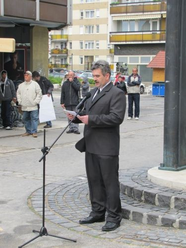 Délután fél háromkor a Jobbik Magyarországért Mozgalom tartott megemlékezést a Kossuth utcai óránál. A köszöntő és egy énekszám elhangzása után Forgó Gyula, a párt városi elnöke szólalt fel.