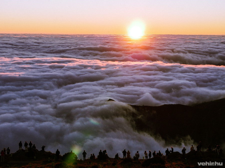 Hogy ez mennyire igaz, a következő nap még inkább bizonyítja. 5:30-kor csörög az óra, megnézzük, eljutunk-e a Pico do Arieerora. Előző este megtaláltuk az Uber helyi változatát Bolt néven, ami a taxinál elfogadhatóbb áron kínál fuvart akár a hegycsúcsra is. Akad is szabad autó, de még nem végeztünk a készülődéssel, s mire lefoglalnám, valaki más lecsap rá. Nem esünk kétségbe, öt perc múlva találunk egy másikat, aztán mire rányomnék a foglalásra, egy harmadikat, jóval olcsóbban. 7 órakor már 1818 méter magasan ücsörgünk, várva, hogy az éjszaka sötétjét átvegye a nappal fénye. A szél cibálja a hajunkat, sokan pokrócba burkolóznak a hideg elől, de a csodáról senki nem akar lemaradni: előbb csak egy vékony sárga-lila csík húzódik meg a horizonton, aztán egyre több szín kerül fel az égi palettára, ahogy a nap dicsőségesen felemelkedik a felhők fölé, amelyek füstnyelvekként nyalogatják a hegyet. Mintha menny és pokol találkozna itt: lent a mélység, a fehér habpamacsok fölött az aranyló fény.