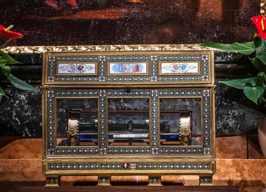 „A keresztény államiság kialakulását idézik fel a barokk korban épült, államalapítónknak szentelt ferences templom mennyezetképei. A karzaton Szent Imre herceg fogadalomtétele tűnik fel, a hajó feletti részben pedig az a jelenet látható, amikor Szent István fogadja a pápa követeit, és megkapja a koronát. A pápa másik ajándéka Istvánnak az apostoli kettős kereszt, amellyel a királyt apostolnak ismeri el a magyar nép megtérítése miatt. A mennyezetre festett történet további részleteit a várnegyedbéli túrákon ismerhetik meg az érdeklődők” – tette hozzá Dr. Nagy Veronika