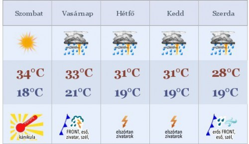 Szombaton folytatódik a napsütéses, meleg idő, csapadék nem várható. A délnyugati szél nyugaton megélénkülhet, másutt gyenge marad a légmozgás. Napközben is kánikula várható, 30-35°C-ig melegszik a levegő.