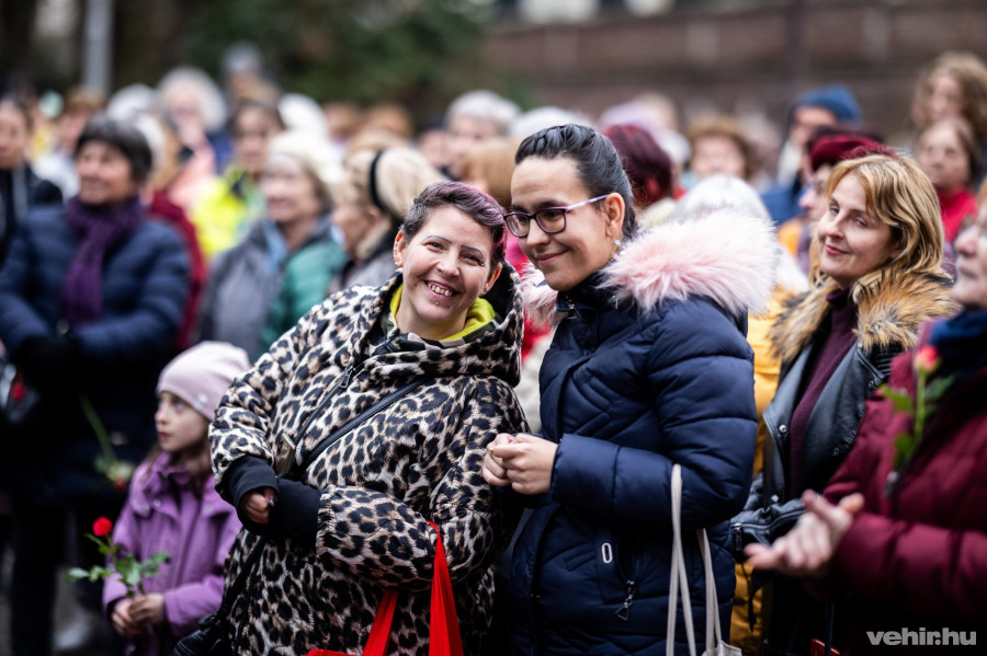 A köszöntők után felcsendültek az ismert dallamok, miközben minden jelenlévőnek egy szál virággal kedveskedtek a színművészek.