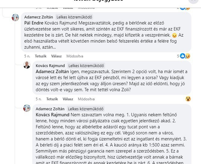A mundér becsületét Kovács Rajmund védte meg a poszt alatt, aki felvetette, hogy arról nem az önkormányzat tehet, ha csak egy pályázó volt, valamint a bérleti díj mértéke is relatív, jelen gazdasági környezetben a vendéglátóipar az egyik legkiszámíthatatlanabb terület a vállalkozóknak. Illetve, ha már az EKF-ből felújították ezt a történelmi vendéglátóhelyet, akkor mégis miért kellene üresen állnia és miért nem lehet neki egy esélyt adni?