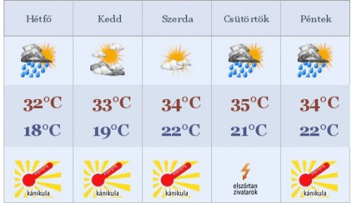 Hétfőn is rekkenő hőség lesz, az északkeleti, keleti és déli országrészben fordulhat elő elvétve kisebb záporeső, esetleg zivatar. A szél gyenge marad. Hajnalban 16-21°C valószínű, napközben 30-35°C-ig melegszik a levegő.
