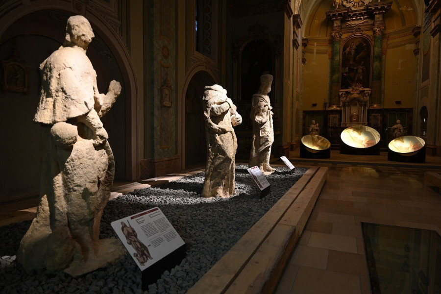 „Amikor a restaurátorok elkezdték vizsgálni a Szentháromság-szobor anyagát, kiderült, hogy 1993-ban az összes figurát műkő másolatra cserélték. Az eredeti szobrok azonban eltűntek, így keresésbe kezdtünk. Vörös Tamásnak, a Veszprémi Érsekség főépítészének jutott eszébe, hogy a veszprémi Davidikum-kollégium kertjében, a kerítésnek támasztva látott néhány kőszobrot, amelyet már teljesen benőtt a borostyán. Bár nagyon rossz állapotban találtunk rájuk, kiderült, hogy ezek valóban a szoborcsoport eredeti figurái” – mondja dr. Nagy Veronika művészettörténész, a Work In Progress kiállítássorozat kurátora arról, hogyan bukkantak rá a barokk Szentháromság-szobor eredeti alakjaira.