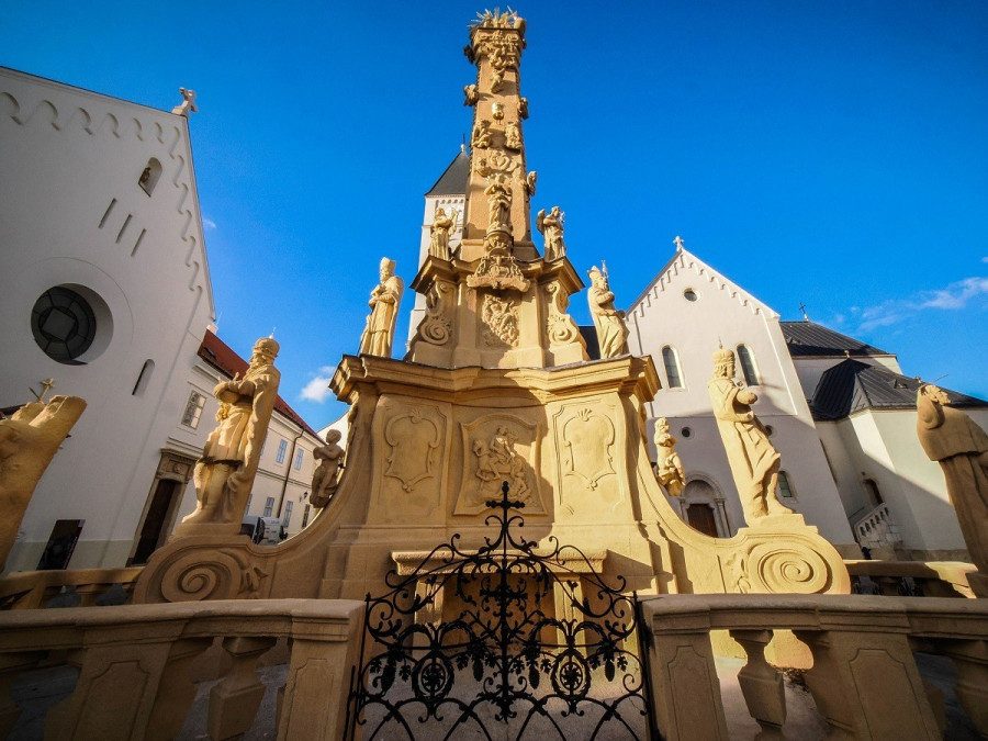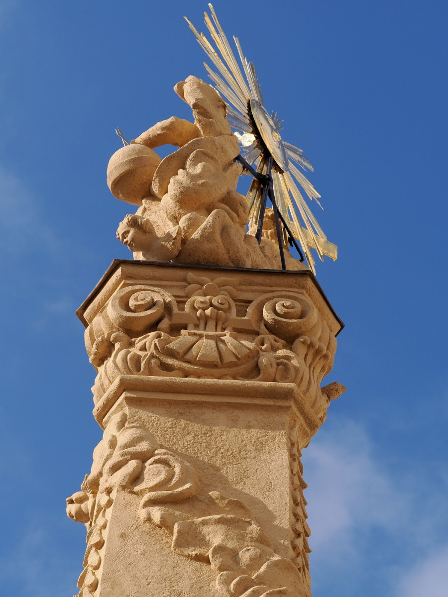 Schmidt Ferenc szobrász-kőfaragó mester alkotása 1750 óta áll a veszprémi vár főterén. Az ország több pontján – például a budai várban, Sopronban, Óbudán, Baján – találunk hasonló szoborcsoportokat, amelyeket pestisoszlopként is emlegetnek, a legtöbbet ugyanis a városokon végigsöprő járványok után emeltették. A veszprémi szoborcsoport azonban sokkal inkább a kereszténység diadalának, egy új korszak kezdetének az emléke: a veszprémi vár hosszú ideig török kézen volt, a magyarok csak komoly harcok árán tudták visszafoglalni.