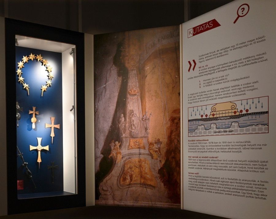 Nem ez volt az egyetlen rejtély a barokk műemlék körül: a talapzat alatt a régészek rég elbontott kanonokházak falmaradványait találták meg, a szoborcsoport eredeti megjelenéséről pedig egy sümegi templom falfestménye tanúskodott. A különleges alkotást a várnegyed 2025-ig tartó megújításának részeként restaurálja a Veszprémi Főegyházmegye.
