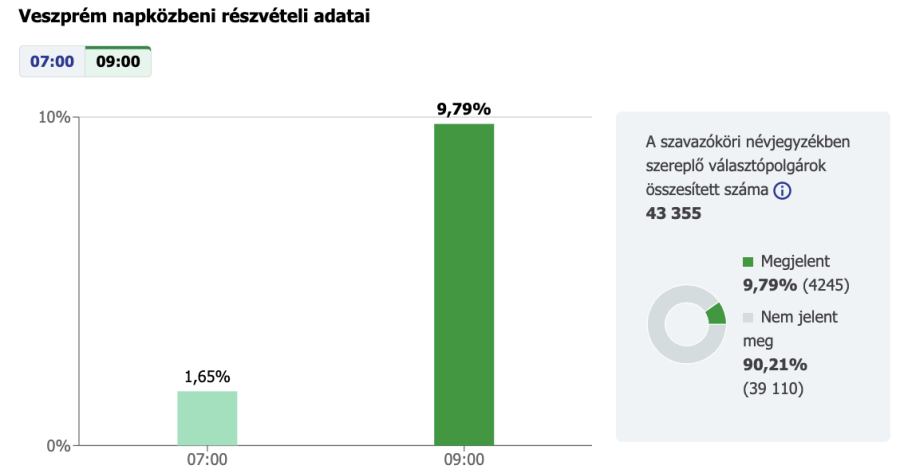 Veszprémben a szavazásra jogosultak 9,79%-a ikszelt reggel kilencig, ez továbbra is enyhén elmarad az országos átlagtól. A legaktívabb választókörzet az 5. számú 11,87%-kal (Haszkovó lakótelep), míg a legkevesebben, 8,5% a 11. számú körzetben (Jeruzsálemhegy, Dózsaváros, Csatárhegy) szavaztak a reggeli órákban.