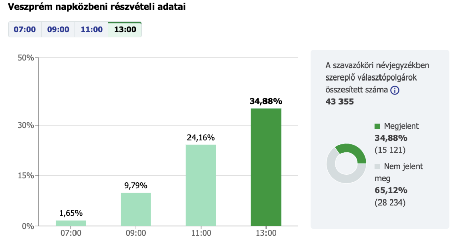 Délután egy óráig a választásra jogosultak 33,14%-a járult az urnákhoz, ami jelentősen nagyobb a legutóbbi választáson tapasztaltnál. 2019-ben ugyanekkor az önkormányzati választáson 26,6%, az európai választáson 24% volt a részvétel.