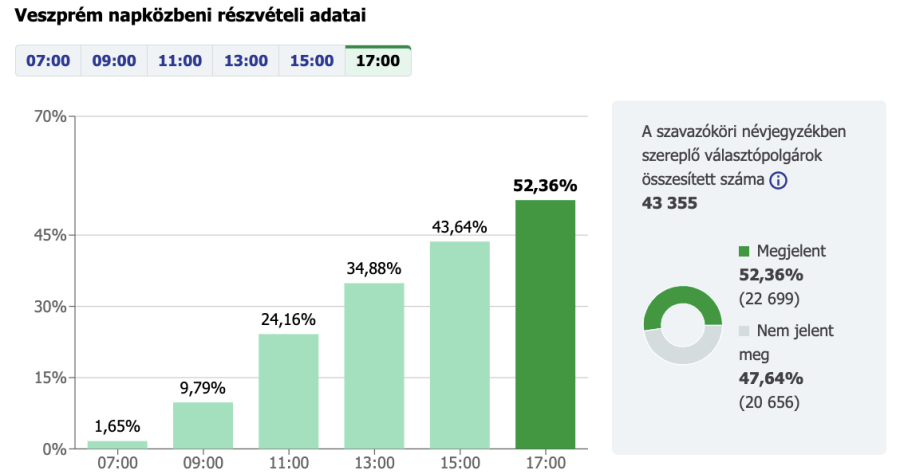 Vasárnap délután 17 óráig a választásra jogosultak fele, 50,69% adta le voksát. Ezúttal kivételesen ne azzal hasonlítsuk össze, hogy hol tartottunk 2019-ben ugyanekkor, mert sokkal beszédesebbek a nap végi adatok: akkor az önkormányzati választáson 48,58%, az európai választáson 43,58% vett részt. Ismétlem, összesen, a nap végén.