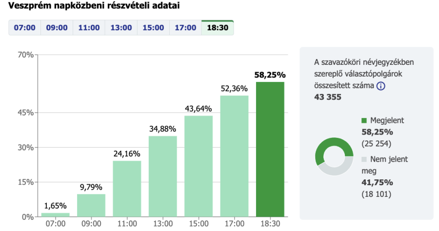 Este fél hétig a választásra jogosultak 56,09 százaléka szavazott országosan. Veszprémben ugyaneddig a választópolgárok 58,25% jelent meg a szavazókörökben. A legaktívabb választókerület a kertvárosi hatos maradt, 65,27%-kal, míg a legkisebb részvételt 48,07%-kal a Haszkovón regisztrálták a 4-es körzetben.