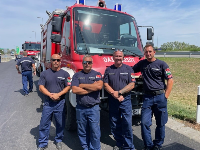 Ungvári Péter és Auerbach Róbert címzetes tűzoltó főtörzsőrmesterek a Pápai Hivatásos Tűzoltó-parancsnokság gépjárművezetői, Lenti Tamás és Katona Krisztián címzetes tűzoltó főtörzsőrmesterek a Veszprémi Hivatásos Tűzoltó-parancsnokság beosztott tűzoltói indultak útnak ma hajnalban, hogy segítsenek külföldi kollégáiknak a balkáni országban nagy területen pusztító erdőtüzek megfékezésében.