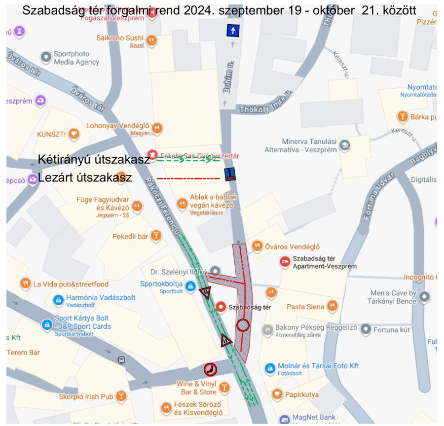 Veszprém város belterületén a Szabadság téren 2024. szeptember 19-től a mellékelten megküldött helyszínrajz szerinti forgalomkorlátozás lép életbe. A Szabadság tér keleti oldali útburkolata közműépítés miatt lezárásra kerül, a forgalom az Óváros tér irányába a kivezető ágon keresztül halad. A Buhim utca gépjárművel csak a Thököly utca irányából marad megközelíthető, a Szabadság téri csatlakozása lezárásra kerül, illetve a Horgos utca irányából a Szabadság téren balra kanyarodási tilalom lép életbe. A korlátozás előre láthatóan 2024. október 21-ig tart.