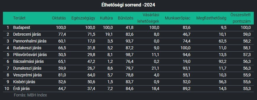 Összesen 174 járást, valamint a vármegyeszékhelyeket külön is vizsgálták az oktatás, az egészségügy, a kultúra, a bűnözés, a munkaerőpiac, a vásárlási lehetőségek és a lakóingatlanok megfizethetősége alapján. Az MBH-nak ez volt a negyedik ilyen felmérése és a listát továbbra is Budapest vezeti, mögötte viszont hajszálnyira vannak egymástól az ország legélhetőbb térségei.