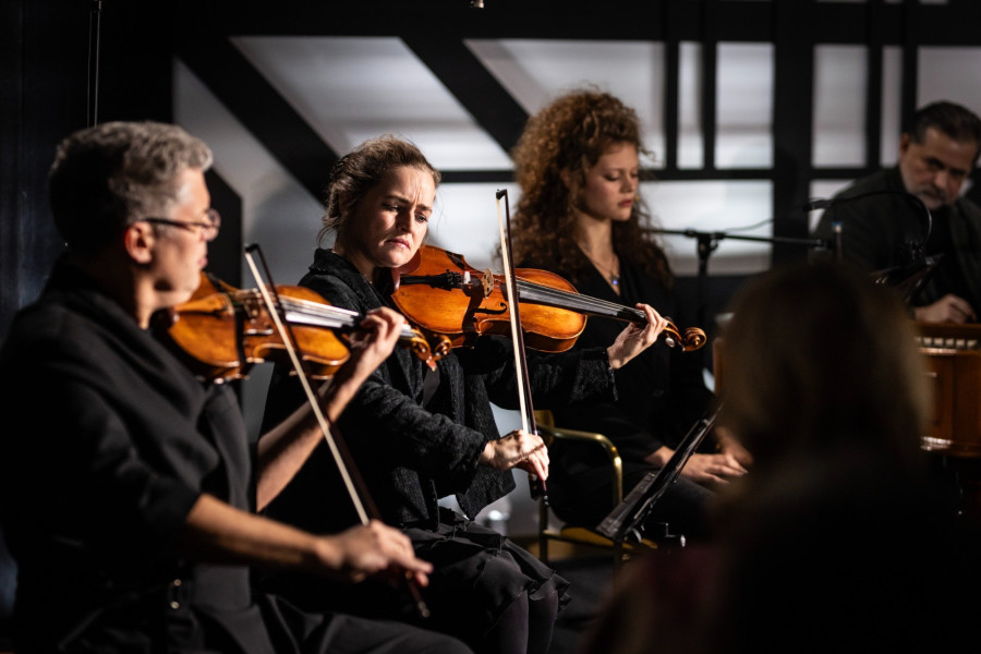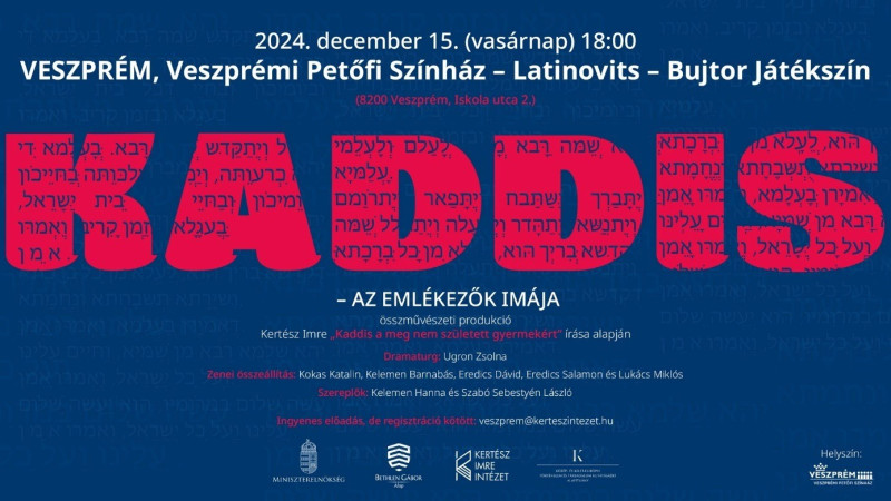 A Nobel-díjas Kertész Imre művéből most elkészült Kaddis – Az Emlékezők Imája című adaptáció egy sokrétű, bensőséges előadás. Az emlékezés, a gyász és egyben az élni akarás megrendítő narratívája. Az ima zenében és prózában felváltva, majd egymásba fonódva szólal meg egy férfi és egy nő tolmácsolásában. A darab zenei anyaga hegedűn, brácsán, klarinéton, harmonikán és cimbalmon szólal meg. A produkcióban Bach, Ravel, Bartók, Schönberg, Sztravinszkij művei és autentikus zsidó zenék oldódnak fel a sajátos zeneiségű Kertész-szövegben.