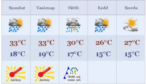 Szombaton reggel változóan felhős időre ébredhetünk, már csak elszórtan fordulhat elő zápor. Gyenge lesz a légmozgás, 16 és 21 °C közé hűl a levegő. Napközben elszórtan, de főleg a Dunántúlon, majd a középső országrészben számíthatunk zivatarokra. A szél gyenge marad, csak zivatarok környezetében erősödhet meg, a csúcshőmérsékletek akár a 30-36 °C-ot is elérhetik majd. Vasárnap hajnalban még többfelé lehetnek záporok, zivatarok, a délkeleti-keleti légmozgás gyenge marad, a legalacsonyabb hőmérsékletek 17 és 21 °C között alakulnak majd.