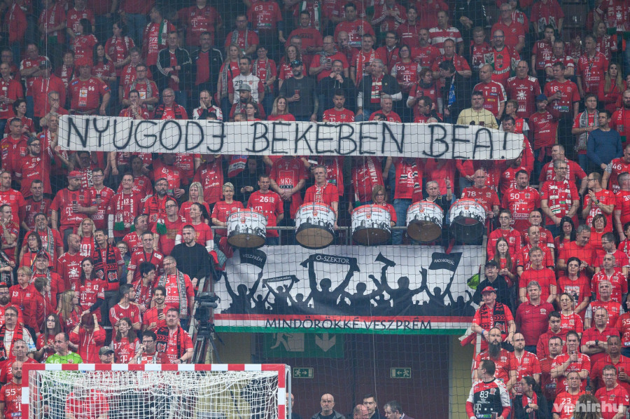 A meccs első percében viszont néma csend honolt az arénában, a szurkolók így emlékeztek meg elhunyt társukról, Vinkler Beáról.