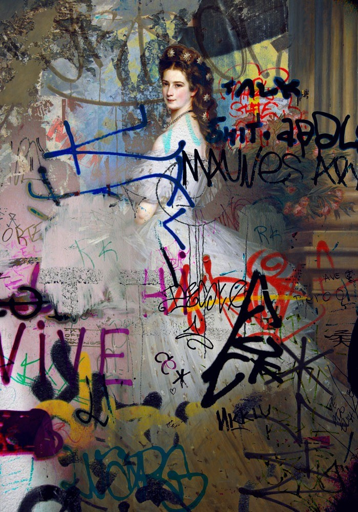 Konrad munkája – azáltal, hogy napjaink vizualitásával övezi a királyné portréját – átélhetőbbé, befogadhatóbbá is teszi Sissi történetét. A tagek erdején át ránk pillantó nő tekintete átsuhan az elmúlt 160 éven, és mintha az idő dimenziója összepréselődött volna, amikor a sík felületre helyezték: szinte karnyújtásnyi közelségbe hozza őt. Ugyanez a hatás a művész többi alkotásán is működik, ezért jó szívvel ajánlom az érdeklődők figyelmébe a honlapját, ahol százszámra találhatók a klasszikus művészetet a graffitivel párosító digitális dekollázsok.