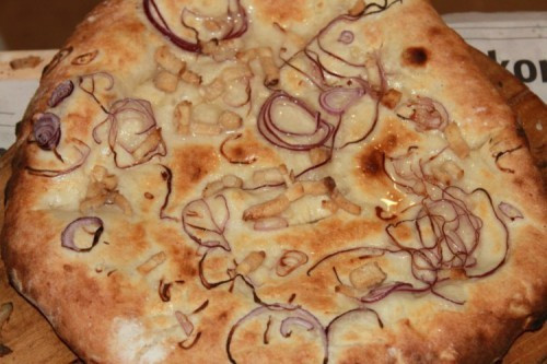 A Bakonyi Ház környékén megcsapta az orromat egy különlegesen finom illat. Bekukkantva az ajtaján, idő asszonyok sürögtek és kínálták a kíváncsiskodóknak a frissen sült langallót. Rózsi néni magyar pizzája kerek, ropog, lefolyik róla a szalonna zsírja, a lilahagyma pedig csak még tökéletesebbé teszi ezt az ízharmóniát. Nem ám bolti készítésű kemencés lángosról van szó, ebbe egy család hagyománya lett belesütve, mivel a receptet még a nagymama tanította.