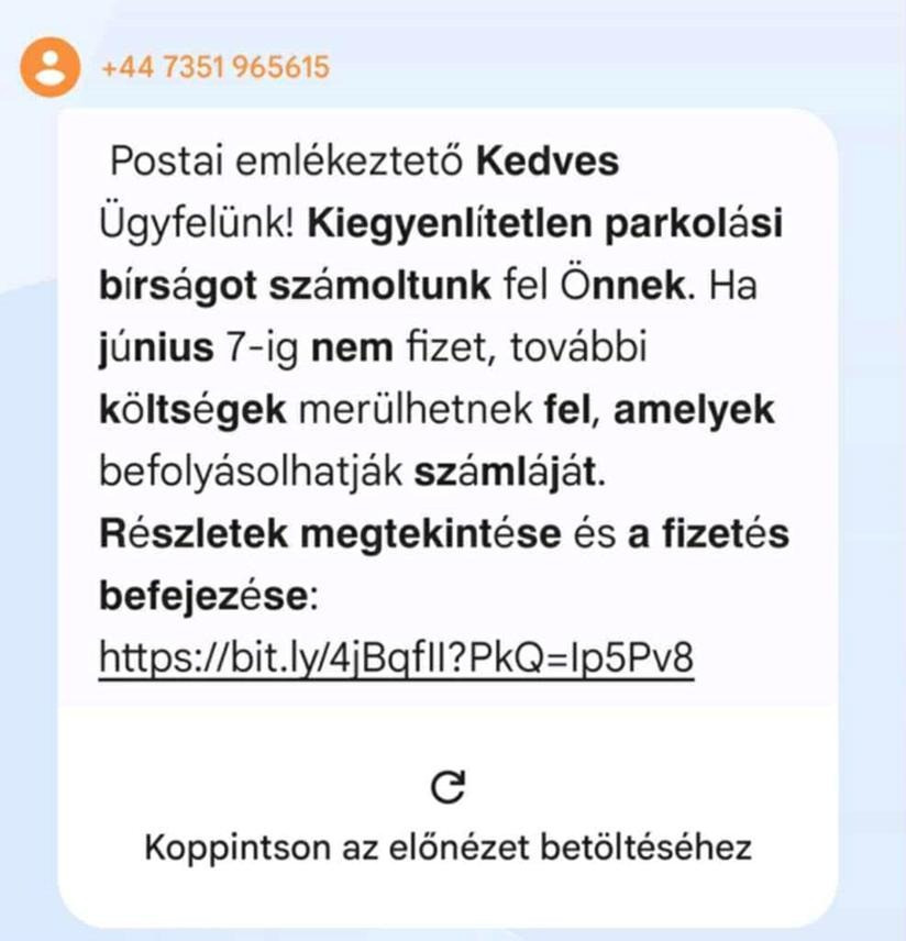 A VKSZ Zrt. nem küld SMS-ben parkolási pótdíjról szóló értesítést, és semmilyen fizetési linket nem mellékelnek SMS-üzenetben. Az eredeti értesítések mindig hivatalos csatornán (levél, társasági e-mail) keresztül történnek. – Áll a veszprémi parkolásért is felelős közszolgáltató közleményében, amiben a múlt héten tapasztalt csalásokra reagálnak.