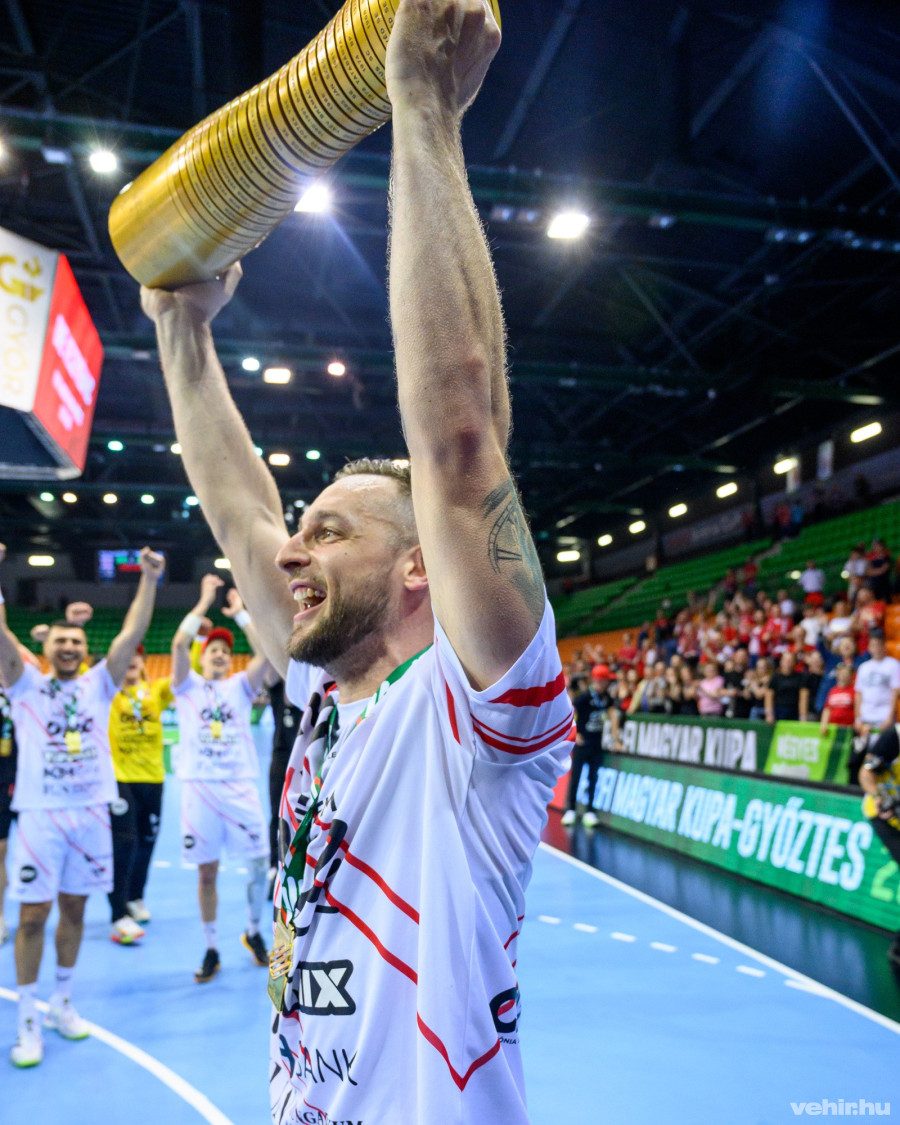 A Veszprém válogatott játékosa, Ligetvári Patrik a hetedik Magyar Kupa-győzelmét ünnepelte.