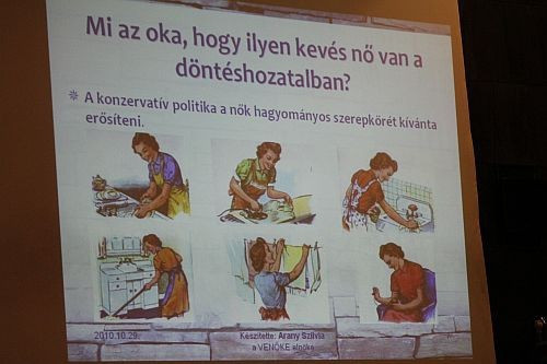 Tudta Ön, hogy a városi eseményeken a hagyományőrzőkön látott reformkori viselet akkoriban lázadás volt a kor kényelmetlen, testsanyargató fűződivatjával szemben? S hogy a feminizmus ügyéért nem csak Kafka Margit vagy az élharcos Bédy-Schwimmel Róza, hanem a kor ünnepelt költője, Pálóczy Horváth Ádám is szót emelt? „A ki tsinosított elméjű Asszony gyermekéből könnyebb nagy embert faragni” – írta anno Pálóczy. Ezeken kívül még számos érdekességet megtudhattunk a múltból, majd Arany Szilvia, a VENŐKE új elnökének Nők a magyar közéletben című előadásából az aktualitásokról is. Többek között kereste az okait annak, hogy miért olyan kevés nő vesz részt a döntéshozatalban (tényeket, számadatokat mutatott országos és európai szinten is), s tapasztalati és érdekképviseleti érvekkel támasztotta alá, hogy miért lenne fontos az asszonyok részvétele ezen a területen is. „Az esélyegyenlőség számos előítélettel, sztereotípiával terhelt, sokak által visszafogott szekere lassan halad. De halad. Férfi társaink kötelessége és érdeke, hogy elősegítsék a fal áttörését, az évszázados sztereotípiáktól korlátozott nők hatékony és méltó képviseleti rendszerének megalkotását és elfogadását. Várjuk és elvárjuk támogatásukat.”