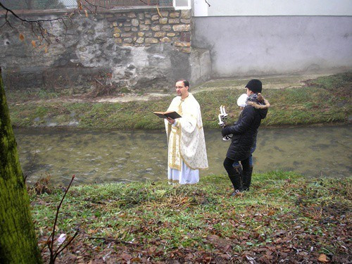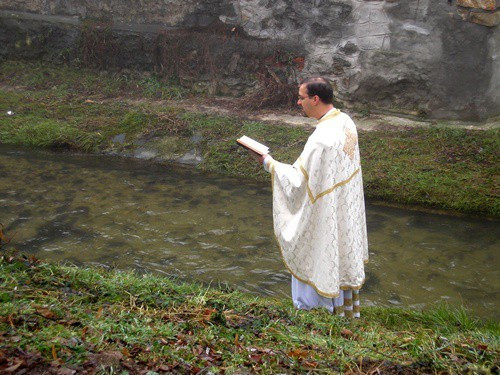 A vízszentelési szertartáson a Séd partján a paróchus elmondta Szent Szofroniosz jeruzsálemi pátriárka ősi vízszentelési imáját, egyenként alámerítve a háromágú gyertya égő szárait, majd a kereszt jelével megszentelte a patak gyors sodrású vizét. Végül a szenteltvíz-szórót megmerítve, a keresztet csókra nyújtotta az egybegyűlteknek, s mindenkit egyenként – a kisgyermekeket is – megáldott és meghintett a megszentelt vízzel.